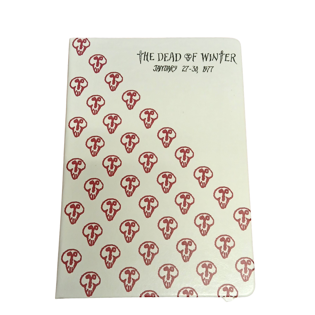 The Dead of Winter: red skull pattern on the front and Gorey's drawing for The Dead of Winter Murder Mystery program on the back.