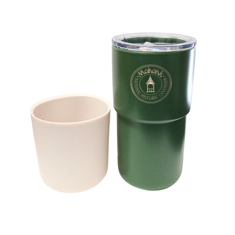 16 ounce green ceramic tumbler with removable off-white non-slip silicone sleeve. Clear lid with slide opening. Laser engraved logo.