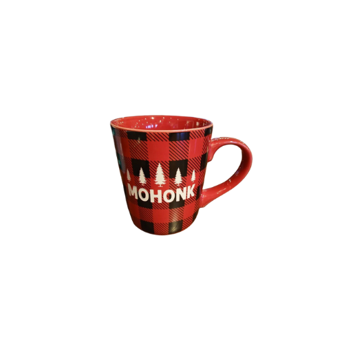15 ounce ceramic black and red plaid mug sandblast etched with with some evergreen trees and "Mohonk". Handwash recommended.