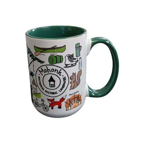 Wanderer mug featuring a wrap around design all of your favorite icons from Mohonk; Sky Top, The Pavilion, local wildlife, and more. 15 ounce ceramic mug with Mohonk green inside and handle. Digitally printed and sublimated for long lasting quality. Dishwasher and microwave safe.